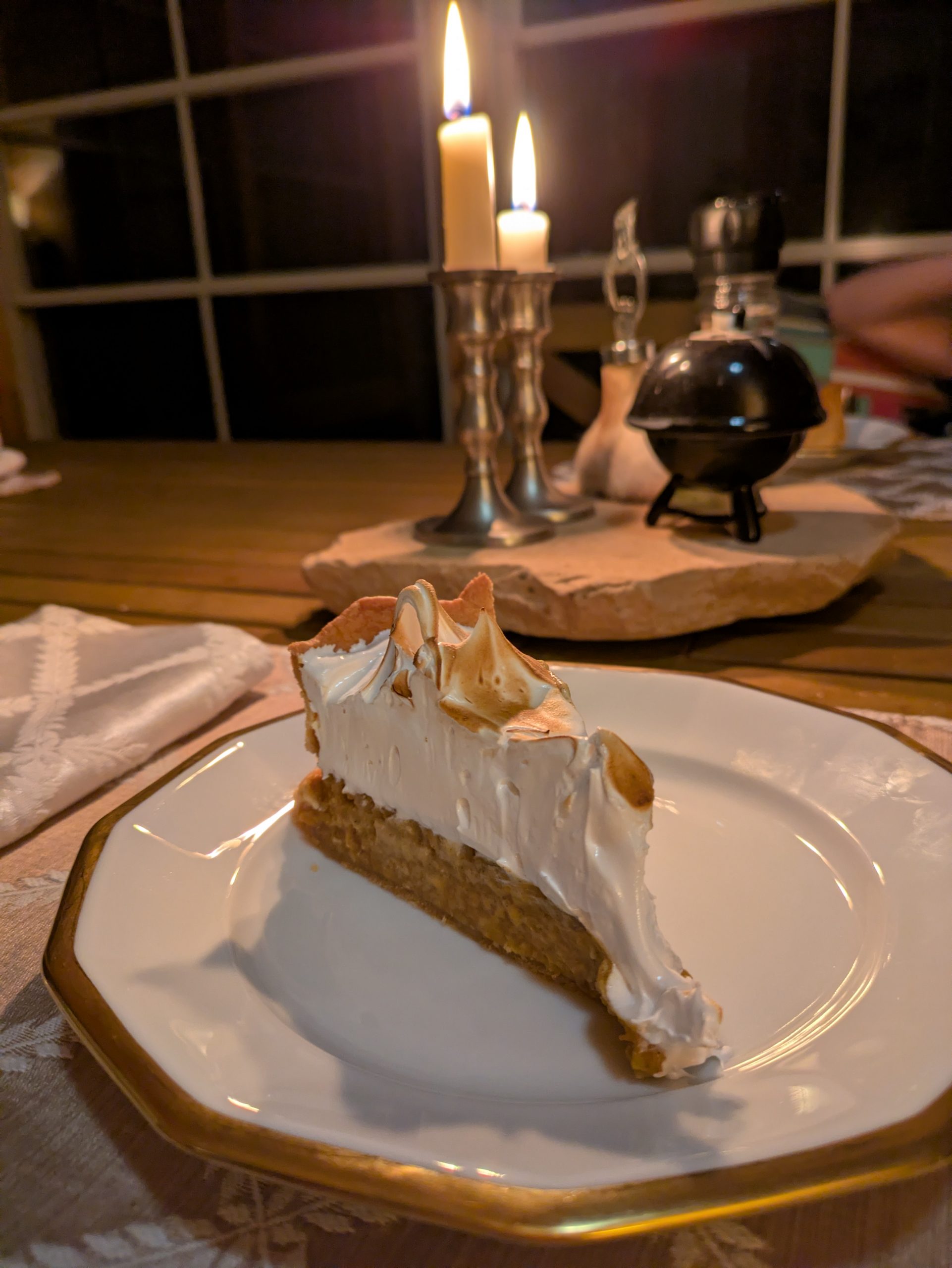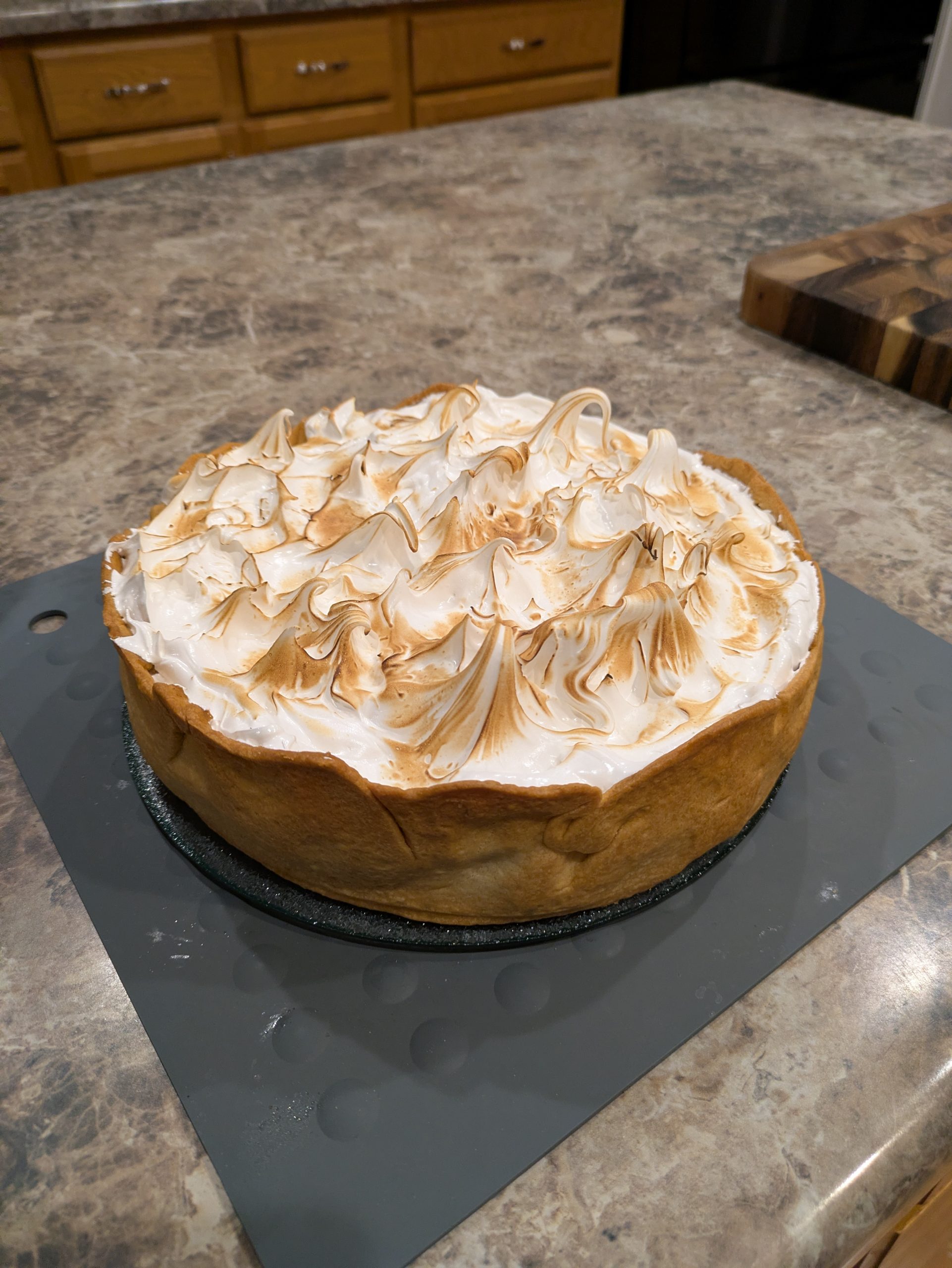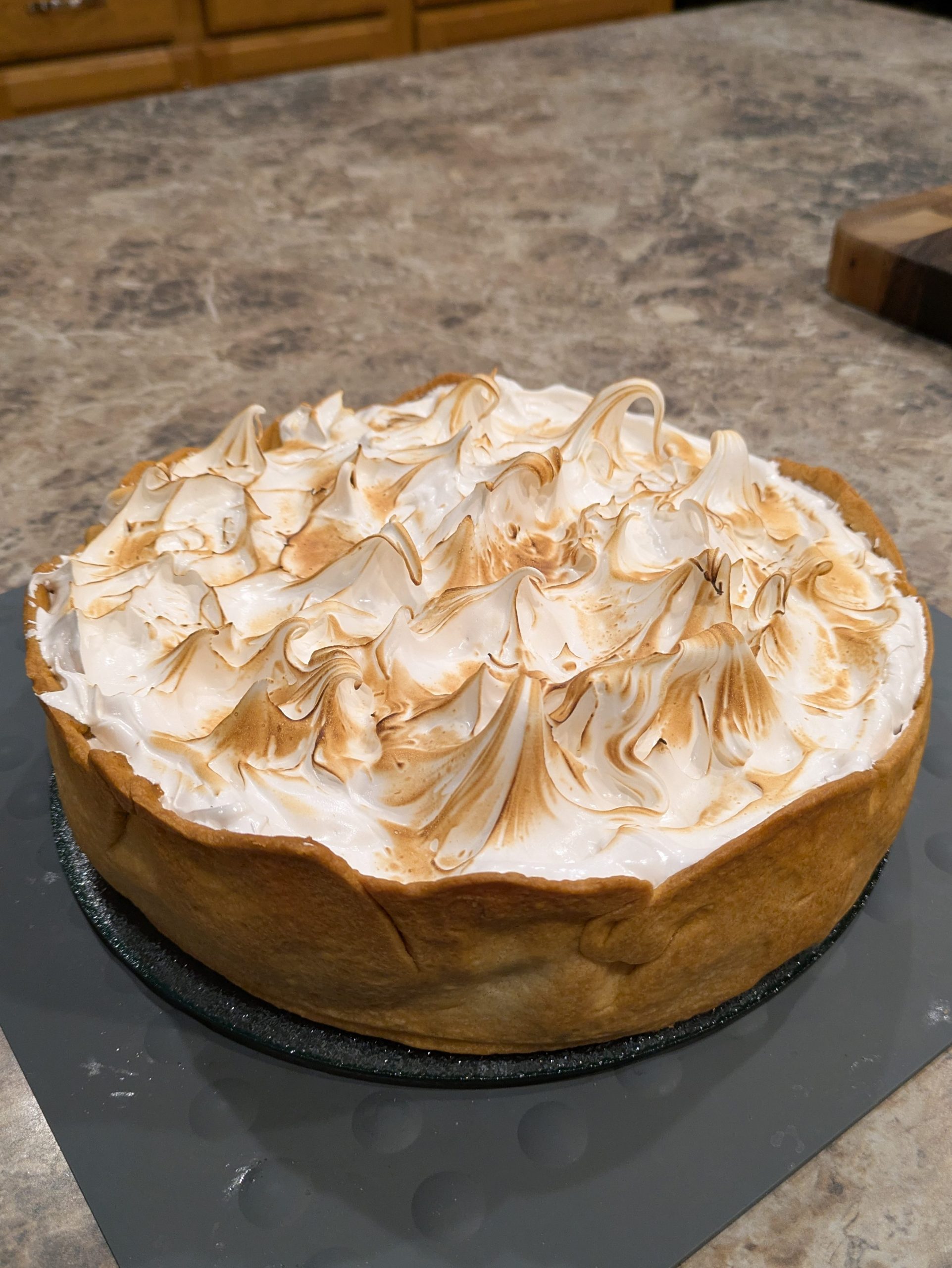 After the pie has completely cooled (or you are ready to serve) dollop or pipe meringue on top of the pie filling. Gently toast the top of the meringue with a kitchen torch, if desired.