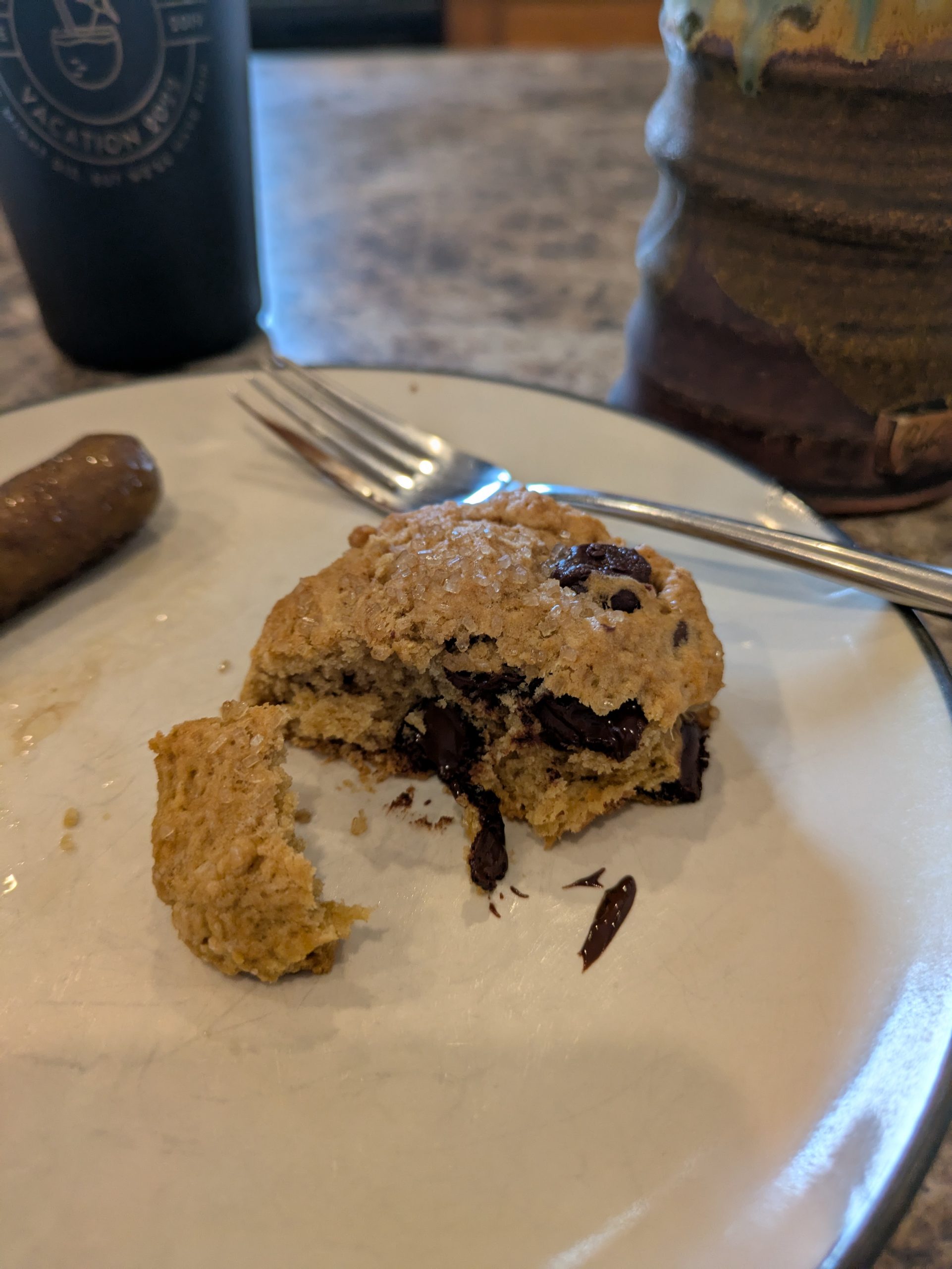 Transfer the flour mixture to a mixing bowl. In a Pyrex, pour the espresso (1/2 cup) and maple syrup and stir together. Start the mixer at the slowest speed and pour the liquid into the dry ingredients. Don’t over mix. Once the batter has come together, hand mix in the chocolate chips.